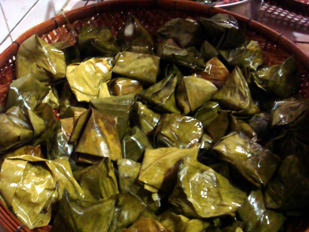 Num Bot is a steamed Cambodian dumpling prepared from rice flour dough and filled with pork, garlic, and spices. The dumplings are shaped by hand, wrapped in banana leaves, and steamed, allowing the dough to become slightly chewy while absorbing the aroma of the leaves.